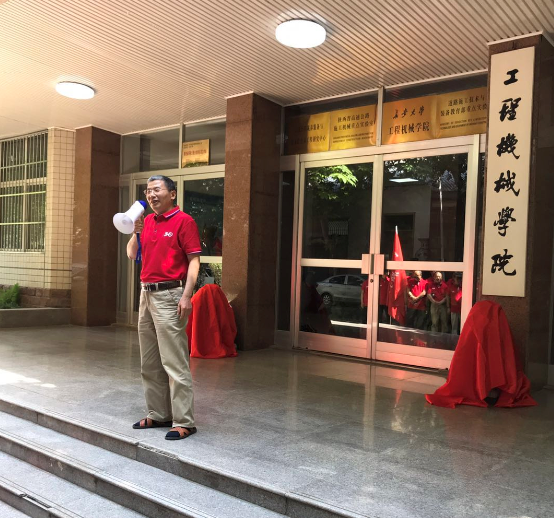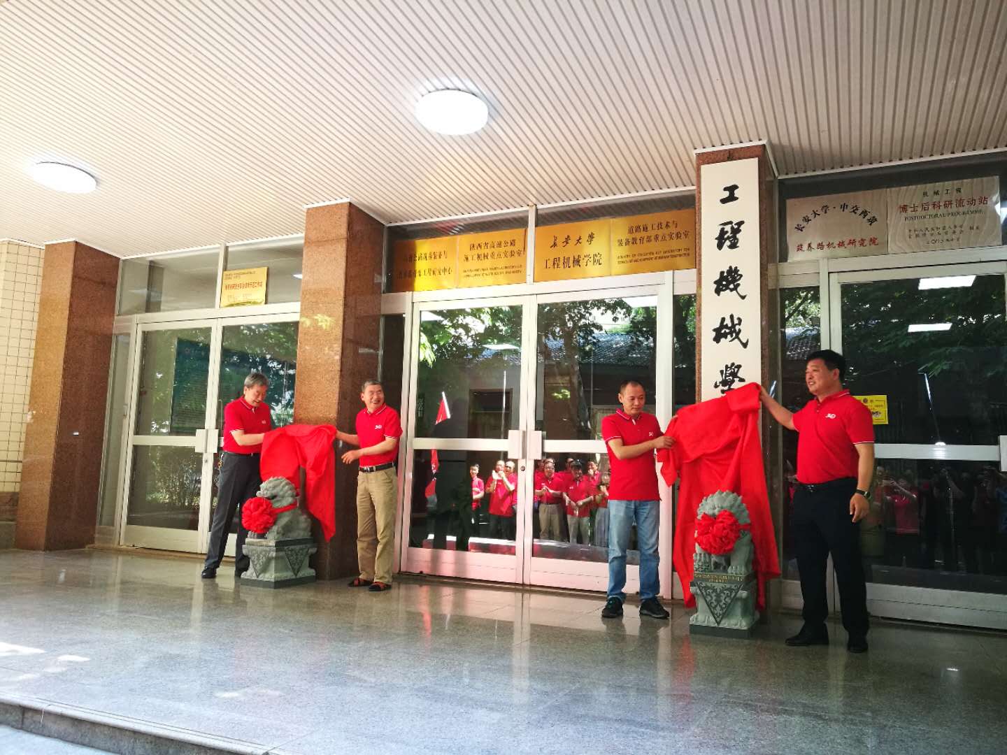 学院领导、校友共同为校友赠送的石狮剪彩。