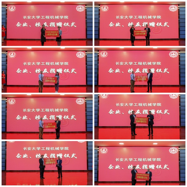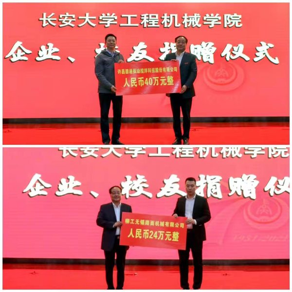 徐引正和学院党政领导代表学校接受了许昌德通振动搅拌科技股份有限公司、柳工无锡路面机械有限公司、河南卫华重型机械股份有限公司、北京加隆工程机械有限公司、河南校友会、北京首旺科技有限公司、罗选民、济南力拓工程机械有限公司/戴纳派克(中国)压实摊铺设备有限公司、无锡中凯机械有限公司/陕西华亿交通科技有限公司、西安卓士博液压工程有限责任公司等12家企业和个人的捐赠。