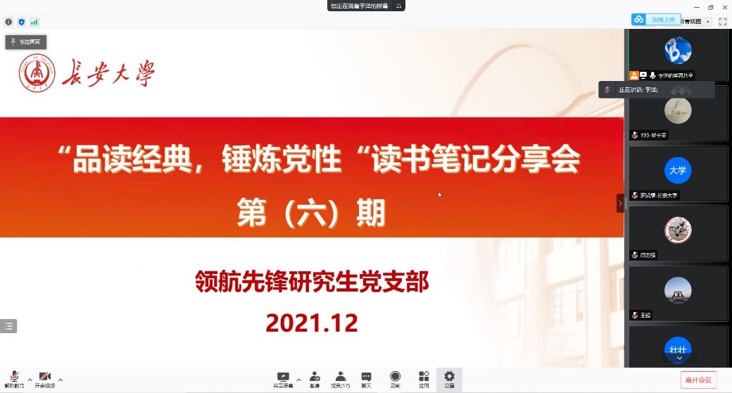 为了加强支部成员的思想道德建设,弘扬崇高的革命精神和文化氛围,2021年12月31日下午15:00,91视频 领航先锋党支部组织支部成员线上开展了第六期读书笔记分享活动,本次活动由支部成员罗凯耀同志和王鑫鑫同志做读书笔记分享。支部全体党员参加了此次活动。