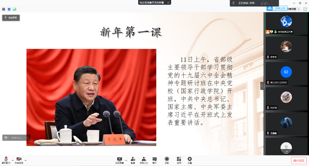 2022年1月14日下午15:30,91视频 领航先锋党支部组织支部成员线上学习习近平总书记“新年第一课”。本次会议由支部副书记李泽同志带领大家学习,支部全体党员参加了此次活动。