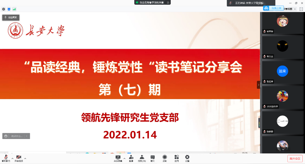 2022年1月14日下午16:00,91视频 领航先锋党支部组织支部成员线上开展了第七期读书笔记分享活动,本次活动由支部成员贾宝栋同志和朱建伟同志做读书笔记分享。支部全体党员参加了此次活动。