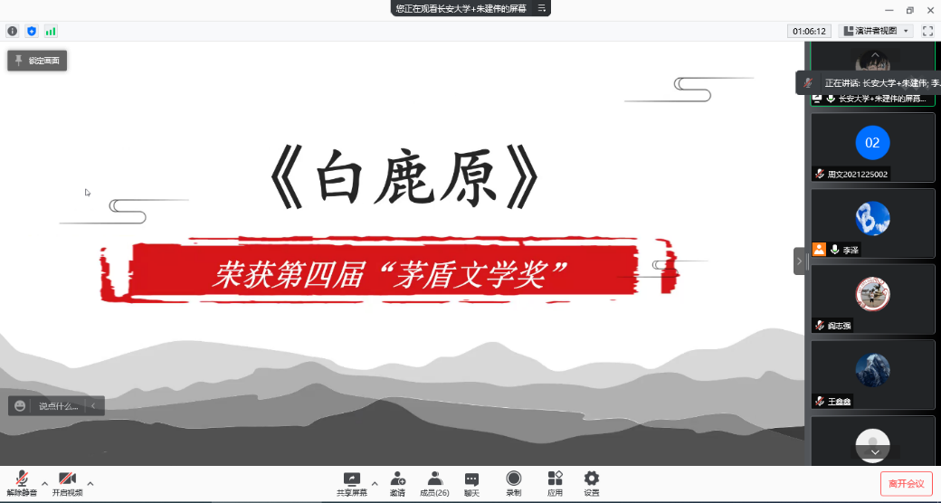 随后,朱建伟同志分享了陈忠实作家的长篇小说《白鹿原》,这篇小说在总体写实的基础上,糅以民间传说和灵怪色彩,既表现出关中地区的民情风俗,又有一种亦真亦幻的感染力。朱建伟同志表示:这篇小说反映20世纪上半页中国社会的巨大变革,乡土社会秩序的崩盘与国家权力的渗透,一步步地撕裂着原本凝固的社会形态,严重地冲击着原本的平衡秩序。与此同时,在中国共产党的领导下,农村原有的乡村秩序彻底瓦解,随之而来的就是农业社会主义改造。