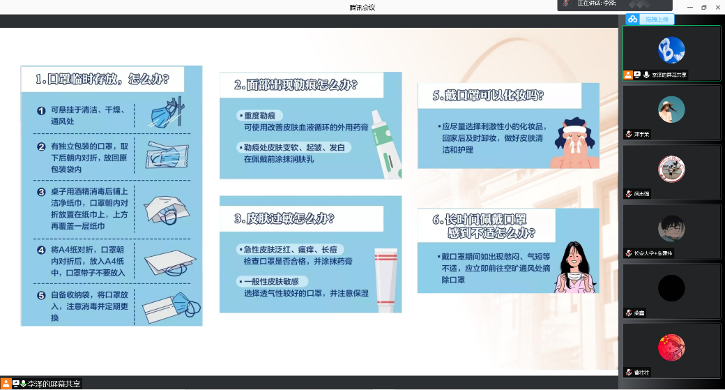 本次线上课堂,李泽同志首先为大家讲解了佩戴口罩的错误事项、佩戴口罩的正确示范以及注意事项。随后,他普及了新冠肺炎病毒的一种变异毒株奥密克戎的特点、造成快速传播的原因等相关知识,呼吁大家提高自我防范意识,积极开展防范措施。