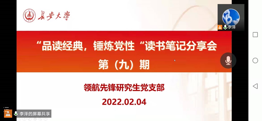 2022年2月4日下午14:30,91视频 领航先锋党支部组织支部成员线上开展了第九期读书笔记分享活动,本次活动由支部成员李泽同志和梁艳彬同志做读书笔记分享。支部全体党员参加了此次活动。
