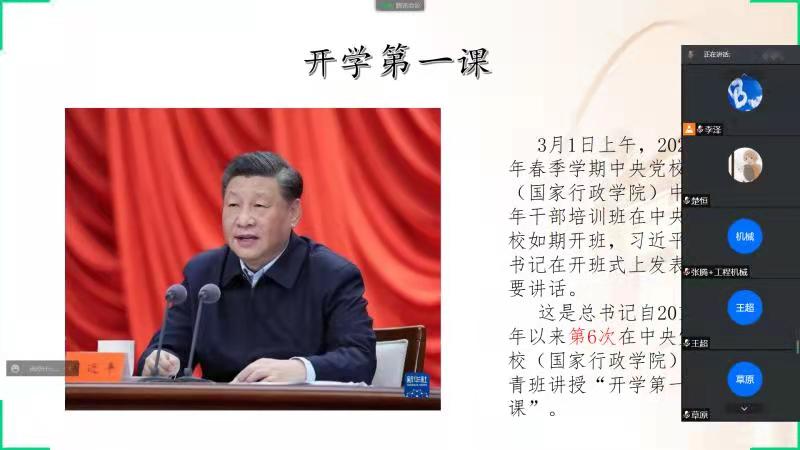 首先,李泽同志带领大家学习习近平总书记在中青年干部培训班“开学第一课”的重要讲话内容。这堂课,饱含着习近平总书记对年轻干部成长成才的浓浓期许,习近平总书记语重心长地说,年轻干部是党和国家事业发展的希望。习近平总书记强调,坚定理想信念不是一阵子而是一辈子的事,要常修常炼、常悟常进,无论顺境逆境都坚贞不渝,经得起大浪淘沙的考验。党员干部一定要加强理论学习、厚实理论功底,自觉用新时代党的创新理论观察新形势、研究新情况、解决新问题,使各项工作朝着正确方向、按照客观规律推进。年轻干部要接过艰苦奋斗的接力棒,以一往无前的奋斗姿态和永不懈怠的精神状态,勇挑重担、苦干实干,在新时代新征程中留下许党报国的奋斗足迹。