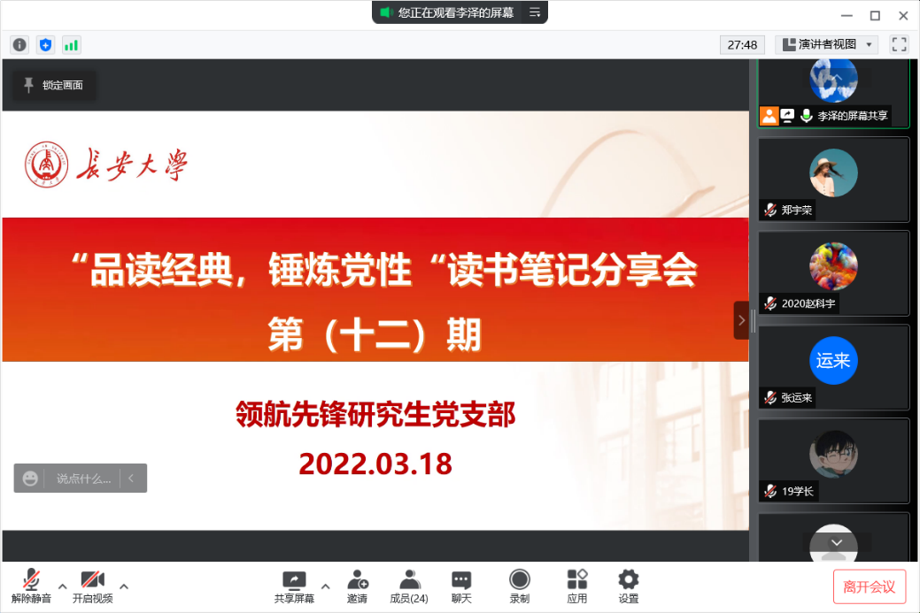 2022年3月18日上午11:00,91视频 领航先锋党支部组织支部成员线上开展了第十二期读书笔记分享活动,本次活动由支部成员赵科宇同志和卢希洁同志做读书笔记分享。支部全体党员参加了此次活动。