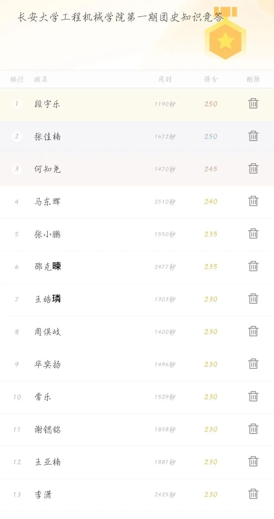 ▲部分学员团史知识答题竞赛成绩