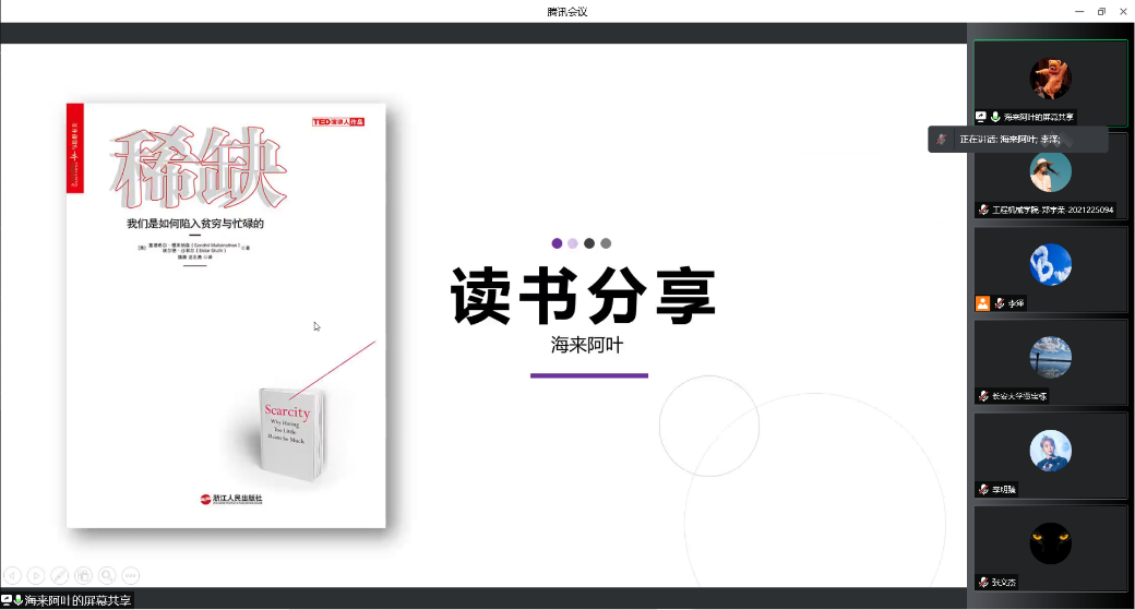 随后,海来阿叶同志分享了《稀缺》。这本书把稀缺定义成了一个心理问题,作者认为,稀缺不只取决于我们现实有多少资源,而且取决于我们主观的需求有多强烈。稀缺会让你过度关注一些事情,它会降低你的带宽的容量,会使我们缺乏洞察力、缺乏前瞻性,还会削弱我们的执行控制力。可以简单地把心智带宽理解为脑子清醒时刻,可以用于集中思考的精力。每个人的心智带宽都是一定的,全部用在了这里,就不能再用在别处了。如果心智带宽经常超载,就会很容易犯下各种低级错误。海来阿叶同志表示:一方面,我们要学会合理利用自己的带宽;另外一方面,我们要关注自己的稀缺心理。在富足的时候要存钱,在带宽充裕的时候要先做事情,只要规划和管理好带宽,稀缺问题就会迎刃而解。