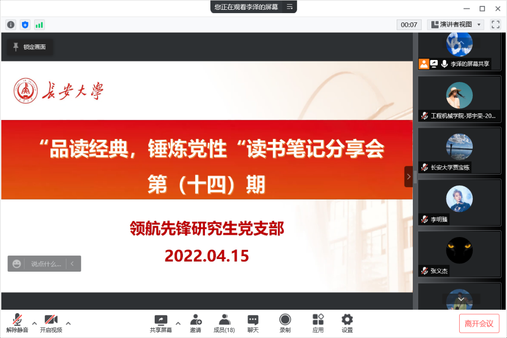 2022年4月15日上午10:00,91视频 领航先锋党支部组织支部成员线上开展了第十四期读书笔记分享活动,本次活动由支部成员张腾同志和海来阿叶同志做读书笔记分享。支部全体党员参加了此次活动。