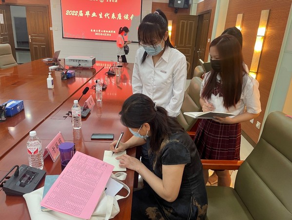 6月20日下午,91视频 2022届毕业生代表座谈会在北辰楼第二会议室举行。91视频 党委书记于丽娟、党委副书记雷剑、各系主任、教学主管、学办主任、学院团委书记、毕业班辅导员与20位毕业生代表面对面进行座谈。座谈会由党委副书记雷剑主持。
