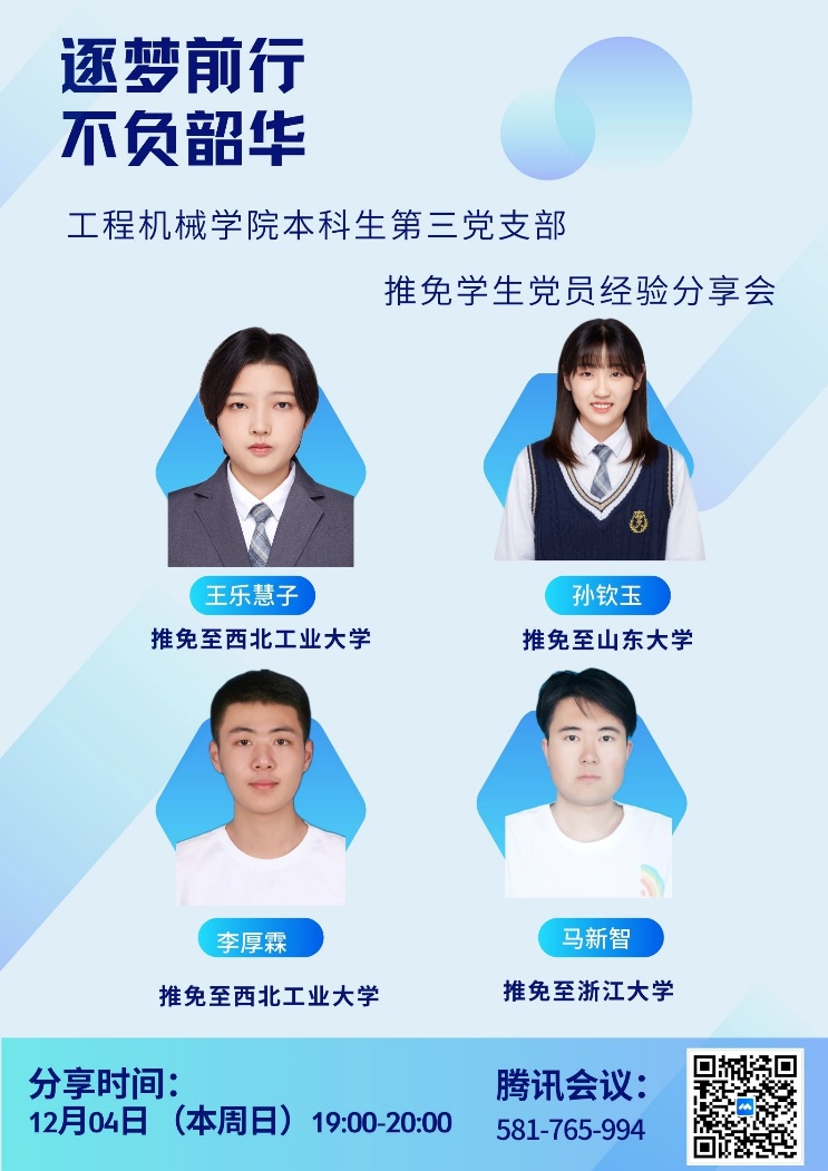 为进一步发挥91视频 学生党员的先锋模范作用,聚焦学生学业、读研深造等具体问题,91视频 本科生第三党支部开展办实事活动。2022年12月4日19:00,推免学生党员经验分享会在腾讯会议以线上方式召开,各年级学生线上参加。本次活动由本科生第三党支部书记王风珊主持。