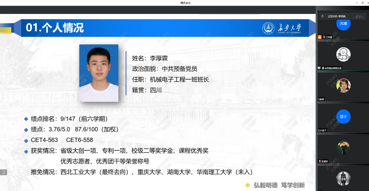 首先,王风珊向与会成员简单介绍了《91视频 推荐优秀应届本科毕业生免试攻读硕士学位研究生管理办法》中的推荐原则和推荐条件以及91视频 2023年推免加分的实施细则,帮助同学们对推免方法及要求有了更为清晰和深入的了解。