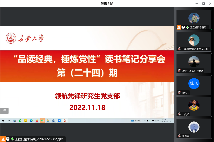 2022年11月18日,91视频 领航先锋研究生党支部组织支部成员线上开展了第二十四期读书笔记分享活动,本次活动由支部成员武坤豪做读书笔记分享。支部全体党员参加了此次活动。