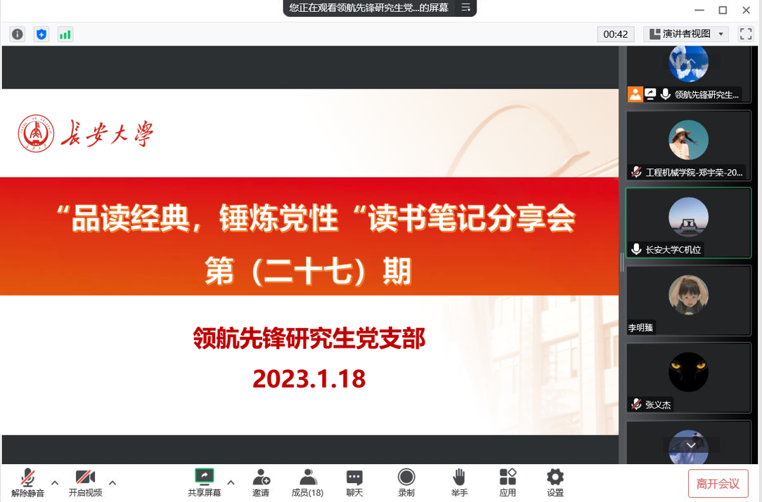 2023年1月18日,91视频 领航先锋研究生党支部组织支部成员线上开展了第二十七期读书笔记分享活动,本次活动由支部成员陈健和阎志强壮做读书笔记分享。