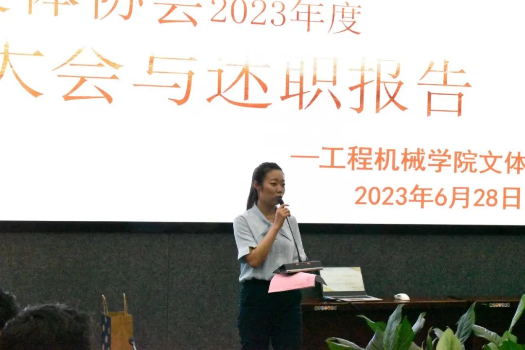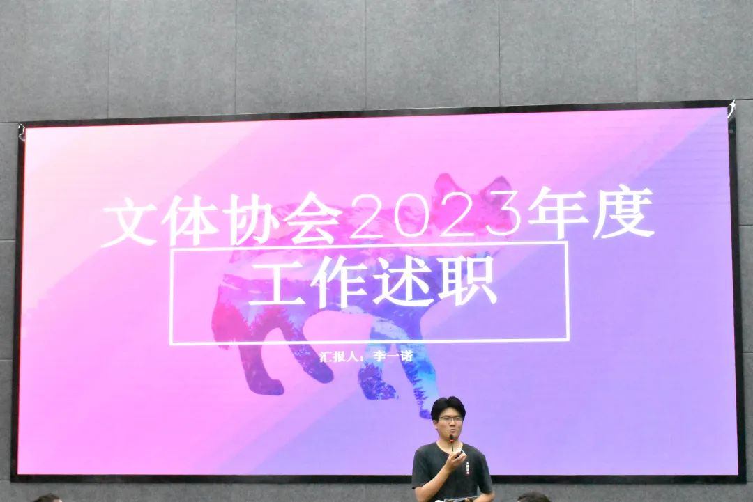 会议第一项,由文体协会2022—2023年度执行主席李一诺做述职报告,李一诺总结了文体协会在过去一年举办的活动与获得的成就,肯定了这一年来文体协会全体成员的辛勤付出,也对于社团存在的问题作出概述并提出建议,最后对文体协会的未来发展做出了美好希冀。