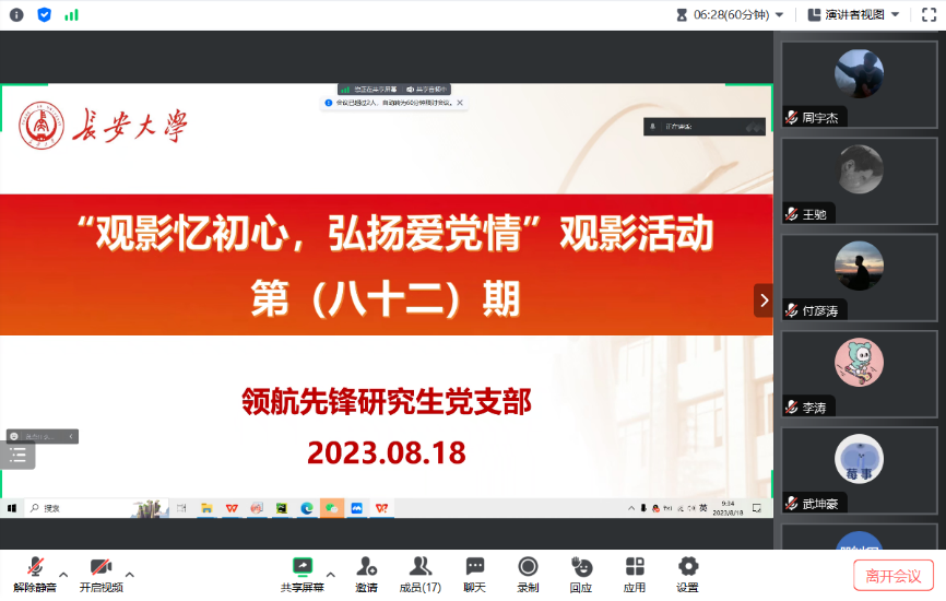2023年8月18日,91视频 领航先锋研究生党支部组织支部成员线上观看了视频《勿忘国耻,警钟长鸣》。支部党员参加了此次活动,本次活动由支部组织委员王晨光主持。
