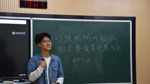 为加强班级凝聚力,明确班级目标,帮助大家更好地规划大学生活,9月22日,91视频 2023级机械4班召开了第一次班会暨观影教育活动。本次活动由班长屈云玮、团支书张梓瑞等班委组织举办,2023级辅导员左意老师和全体同学参加。