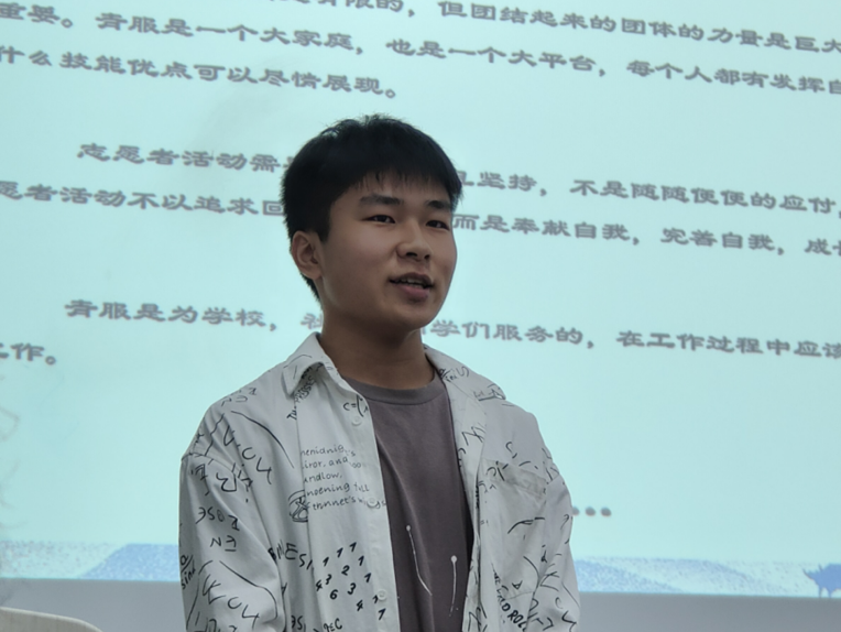 接着,由青年志愿者服务队副主席王梦瑶发言,他提到青服是一个大家庭,每个人都有发挥自己才能和作用的机会,希望同学们用心坚持志愿活动,在活动中奉献自我、完善自我、不断成长。
