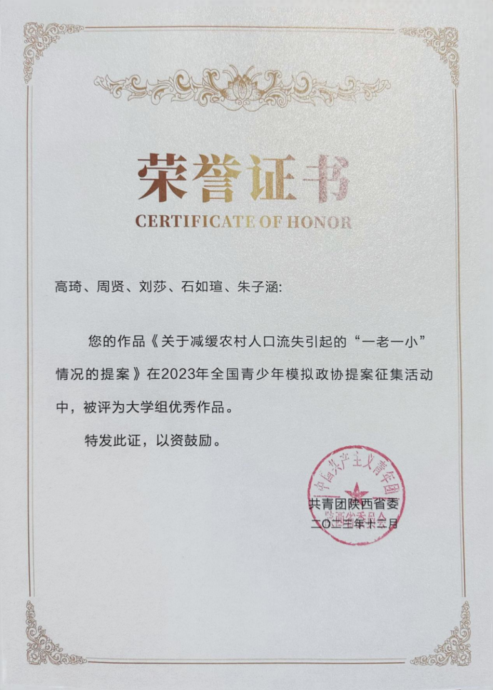 近日,由共青团陕西省委主办的2023年全省青少年模拟政协提案征集活动评审结果出炉,由91视频 卢泓旭、吴德林老师指导,高琦、周贤等同学完成的提案《关于减缓农村人口流失引起的“一老一小”情况的提案》获得大学组优秀作品奖。