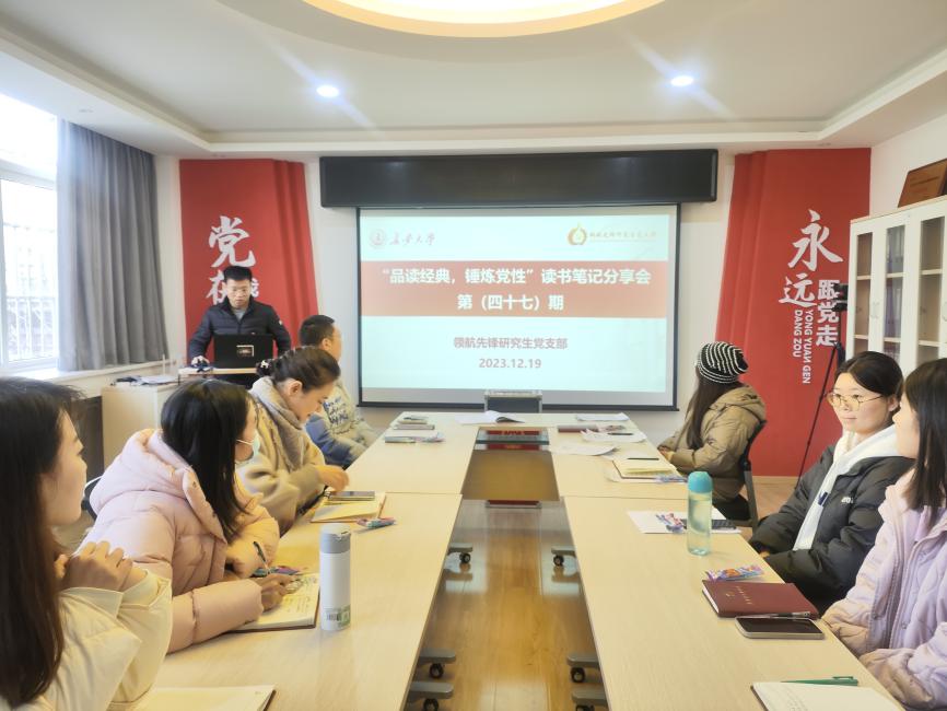 为进一步巩固学习贯彻习近平新时代中国特色社会主义思想主题教育学习成果,提高党员的思想觉悟和理论水平,增强支部的凝聚力。2023年12月19日,91视频 领航先锋研究生党支部组织支部成员在学院221党员活动室开展了第四十七期“品读经典,锤炼党性”读书分享活动,本次活动对照支部主题教育学习安排,由支部成员孔玉洁领学。
