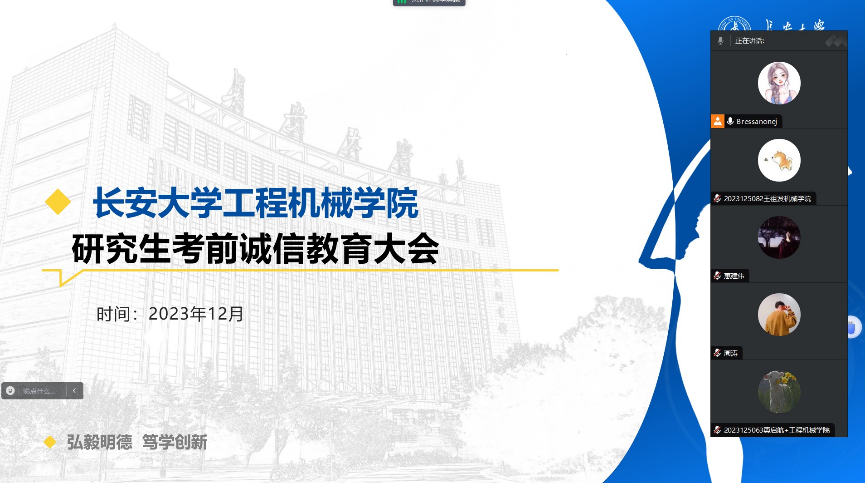 临近期末,为端正考风考纪,进一步加强学院学风建设,培养学生的学术诚信、营造浓厚的学术氛围,2023年12月20日,91视频 线上开展了学术诚信教育讲座。研究生辅导员高婷婷、寇文娟、张琳璇,2023级全体研究生参加。学院希望通过此次讲座让学生更加深入地了解学术诚信的重要性,增强他们的学术自律意识,倡导严谨规范的学术行为,营造良好的学术环境,避免作弊和抄袭等不良行为。