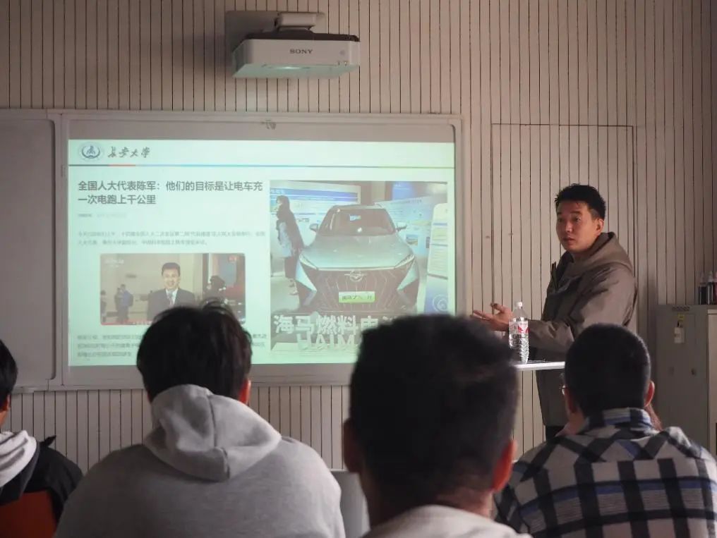 首先,董渊哲老师带领同学们学习了政府工作报告,了解过去一年我国发展状况,对于其中提到的“加快发展新质生产力”这一热门话题,董老师向同学们重点介绍了与机械专业密切相关的新能源汽车产业的火热现状,他希望同学们能够深耕专业学习,紧跟时代前沿,创新思维,不断提高知识素养和创新实践能力,以实际行动为加快发展新质生产力展现青年担当。