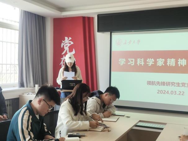 接着,支部副书记寇文娟以“弘扬科学家精神”为题,同支部成员分享了朱光亚、钱学森、屠呦呦等人的故事,生动阐释了科学家精神的丰富内涵——胸怀祖国、服务人民的爱国精神,勇攀高峰、敢为人先的创新精神,追求真理、严谨治学的求实精神,淡泊名利、潜心研究的奉献精神,集智攻关、团结协作的协同精神,甘为人梯、奖掖后学的育人精神。寇文娟表示,在科技发展不断创新的当代中国,科学家精神主要蕴含的六大内容值得我们反复学习与深刻理解。科学家精神倡导的六大精神,实际上也是对研究生的一种要求和指引。在学习生活中,我们要将科学家精神牢记于心并努力外化于行,将科学家精神的丰富内涵升华为我们自身的品质,不断促进我们在研究生学习阶段的进步。