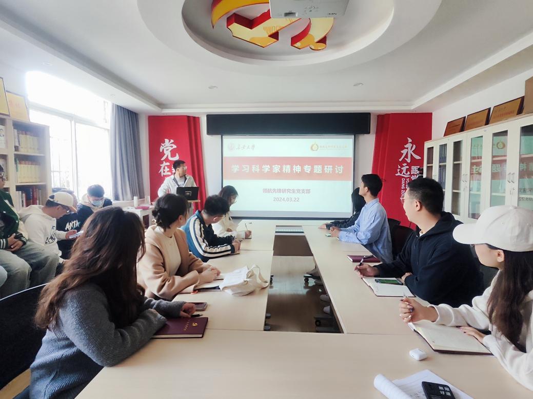 2024年3月22日上午10时,91视频 领航先锋研究生党支部在机械楼221会议室开展“学习科学家精神”专题研讨会。本次研讨会由组织委员王晨光主持,支部全体成员参加。
