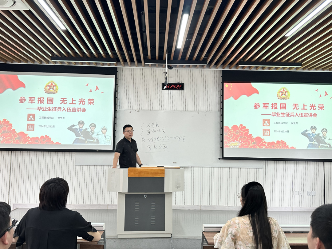 为积极动员大学毕业生参军入伍,营造浓郁参军氛围,2024年5月20日,91视频 2024届本科毕业生征兵宣讲会在渭水校区修远3102教室顺利举行。学院征兵工作专干倪生冬老师作了“参军报国,无上光荣”为主题的国防教育及征兵政策宣讲,2024届100余名本科生参会,会议由2020级辅导员杨文佳老师主持。