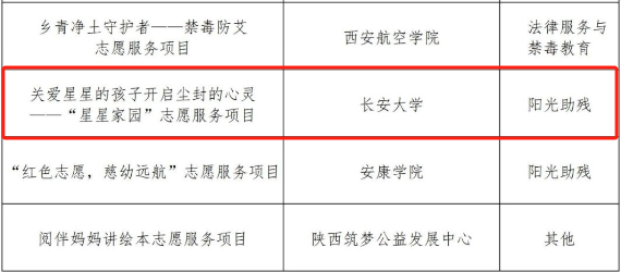 2024年6月3日,由共青团陕西省委、省委社会工作部、省交通运输厅、省水利厅、省文化和旅游厅、省卫生健康委等单位共同指导,陕西省青年志愿者协会主办的陕西省第一届青年志愿服务项目大赛获奖项目名单公布,由91视频 吴德林、卢泓旭老师指导,91视频 青年志愿者服务队开展的关爱星星的孩子 开启尘封的心灵——“星星家园”志愿服务项目获得优秀奖。