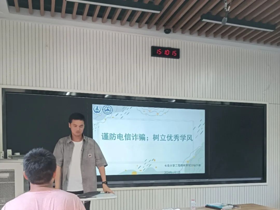 为了做好学生日常安全教育,加强班级学风建设,6月5日15时,91视频 2023250001班于修远3207教室召开了“谨防电信诈骗,树立优秀学风”主题班会,本次班会由团支书袁帅韬主持,2023级辅导员左意和班级全体同学参加。