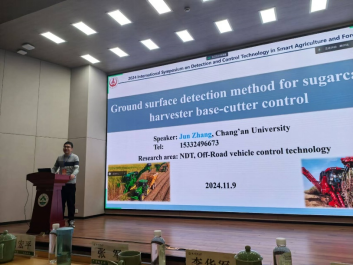会议中,张军副教授发表了题为甘蔗收割机切刀智能控制的地面检测方法的演讲。副教授首先介绍了利用探地雷达(GPR)进行检测的方法。该技术通过在甘蔗收割机上安装GPR,并通过正反演试验验证了其有效性。即便在模拟甘蔗地中存在石头、杂草等复杂情况下,GPR仍能保持高精度检测。尽管GPR作为一种高效的无损检测方法,其高昂的成本促使研究团队提出了另一种接触式测量方法,并通过试验验证了其可行性。此外,还提出了自适应控制系统的设计,并在广西的农场进行了现场试验。通过将多个传感器集成至甘蔗收割机,并进行机电液联合仿真,最终在甘蔗收割的检测与控制方面验证了该方法的有效性。