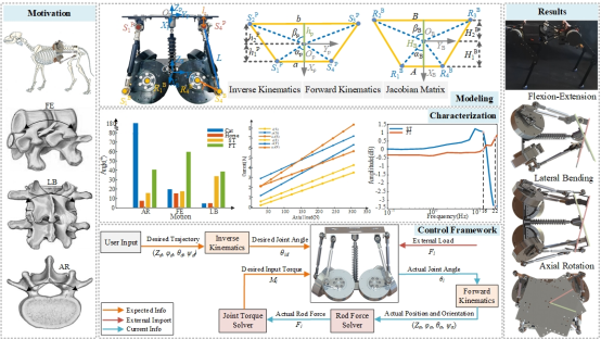 躯干作为动物身体不可或缺的部分,除了为身体提供支撑以外还能展现出多种灵活的运动,目前应用广泛的四足机器人多为刚性躯干,相较四足动物而言这种机器人缺乏结构灵活性和运动多样性。因此,为了使四足机器人具备生物躯干灵活运动的功能,本文基于生物躯干的形态结构和运动原理设计了一个用于四足机器人的主动灵巧仿生躯干,模拟了四足动物的脊柱以及相关肌肉结构,可以实现动物躯干包括弯曲、伸展、侧弯和轴向旋转在内的多种运动,分析了躯干的运动学、工作空间、结构动力学、负载能力以及灵巧性能,还加入了被动弹簧模拟椎间盘的减震和承载。此外,创新的仿生躯干在四足机器人上得到应用,并验证了躯干的灵活性和应用于足式机器人的有效性,为仿生四足机器人的创新发展提供了新的研究思路。