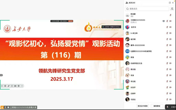 为扎实开展深入贯彻中央八项规定精神学习教育,深入领会全国两会精神,强化青年党员党性修养与使命担当,91视频 领航先锋研究生党支部开展第116-118期“观影忆初心 弘扬爱党情”观影活动,引导党员筑牢信仰之基、践行报国之志,在学思践悟中展现新时代机械学子的责任担当。