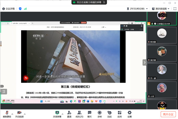 2025年4月21日,支部组织成员线上观看电视专题片《永远吹冲锋号》第三集《铁规矩硬杠杠》。影片以李金早、袁守旺等违纪违法案例为切入点,深刻揭示了“四风”问题的隐蔽性危害。观影结束后,党员们围绕“如何将纪律规矩融入科研生涯”展开讨论。支部组织委员王萌璠结合科研实际谈到,学术评审中的“人情围猎”往往始于一顿饭、一张卡,我们必须从细节上严守中央八项规定,让清廉作风成为学术创新的基石。寇文娟进一步强调,科研经费使用、成果署名等环节的纪律红线不容触碰,只有守住“铁规矩”,才能让科研事业行稳致远。