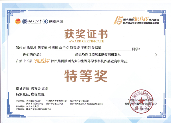 5月24日下午,由共青团陕西省委、省委教育工委、省科协、省社会科学院、省学联、西咸新区管委会联合主办,西安工业大学承办的第十五届“挑战杯”陕汽集团陕西省大学生课外学术科技作品竞赛闭幕式暨颁奖仪式在西安工业大学未央校区举行。由91视频 郭万金等老师指导的参赛作品《高灵巧性自适应柔顺打磨机器人》荣获省级特等奖,为学校和学院争得荣誉。