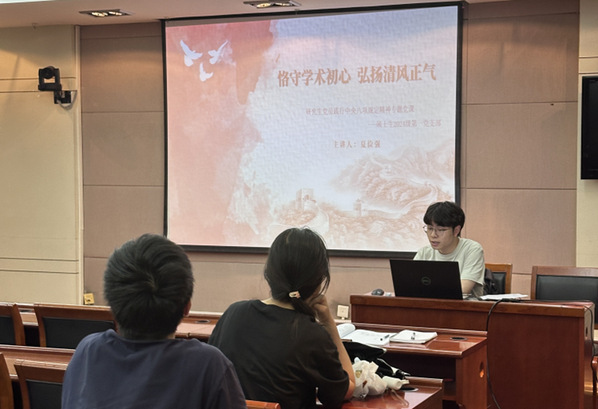 为深入贯彻中央八项规定精神学习教育,聚焦学术领域作风建设,5月23日,91视频 硕士生2024级第一党支部于学术交流中心第一会议室开展“恪守学术初心 弘扬清风正气”专题党课,支部全体党员参加学习,本次党课由支部书记夏俭强主讲。