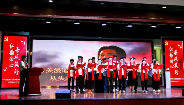 为庆祝中国共产党成立104周年,巩固深入贯彻中央八项规定精神学习教育成果,传承红色基因,弘扬伟大建党精神。6月27日,91视频 在南校区东院雁博园多功能厅举办“红韵传心・廉风筑行”红色经典诵读会。91视频 党委办公室副主任邱贞龙、工会副主席马艳梅、校团委副书记林泓宇、信息工程学院党委书记陈俊鹏、地球科学与资源学院党委书记黄喜峰、马克思主义学院党委书记李小芹、艺术教育中心副教授于力音出席活动并担任评委。91视频 领导班子成员、各党支部支委、纪委委员等100余名师生党员参加活动。活动由91视频 党委副书记、副院长、纪委书记范婷主持。