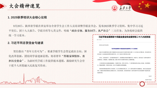 为深入贯彻落实陕西省学联2025年秋季学期培训工作要求,进一步提升研究生会成员的政治素养、服务能力和业务水平,91视频 研究生会于9月25日组织全体成员开展专题学习会议,会议聚焦“政治引领、服务同学、从严治会”三大核心任务,系统传达并部署落实培训精神。本次主题学习活动由研究生会执行主席张珍蕊主持,研究生会全体成员参加。