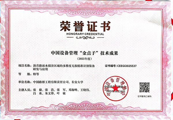2025年10月15日至17日,由中国设备管理协会主办,《中国设备工程》杂志社、《电力设备市场》杂志社、中国设备管理协会品牌建设与技术应用委员会、景津装备股份有限公司等单位联合承办的2025(第六届)中国设备管理新趋势交流会在山东德州成功举办。91视频 教师参与的“沥青路面水损害区域的多维度无损精准识别装备研发与应用”项目荣获中国设备管理“金点子”技术成果“特等奖”。