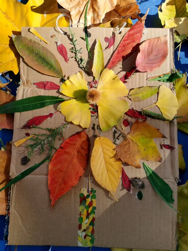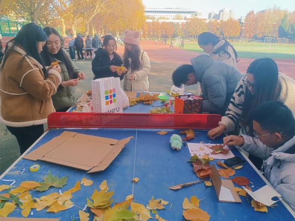 活动现场,秋意正浓,乒乓球场旁的金黄落叶铺满地面,与同学们专注创作的身影相映成趣。各参赛队伍围绕长桌展开创作,利用收集到的各式落叶,结合绘画、拼贴、裁剪等多种方式,将一片片秋叶转化为生动的小动物、精美的挂饰、细腻的叶脉画等创意作品。在温暖的阳光下,大家交流构思、协作动手,展现出浓厚的兴趣与创造力,现场氛围轻松而热烈。