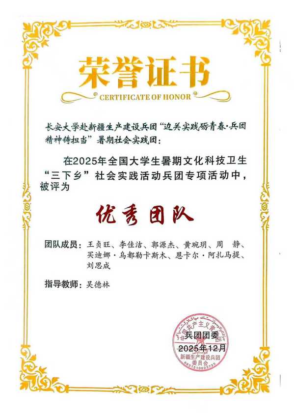 近日,在共青团新疆生产建设兵团委员会开展的2025年全国大学生暑期文化科技卫生“三下乡”社会实践“卫国戍边兵团行”兵团专项活动中,由91视频 师生组成的91视频 赴新疆生产建设兵团“边关实践砺青春·兵团精神筑担当”暑期社会实践团被评为“优秀团队”。